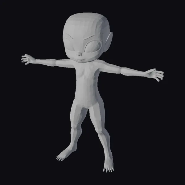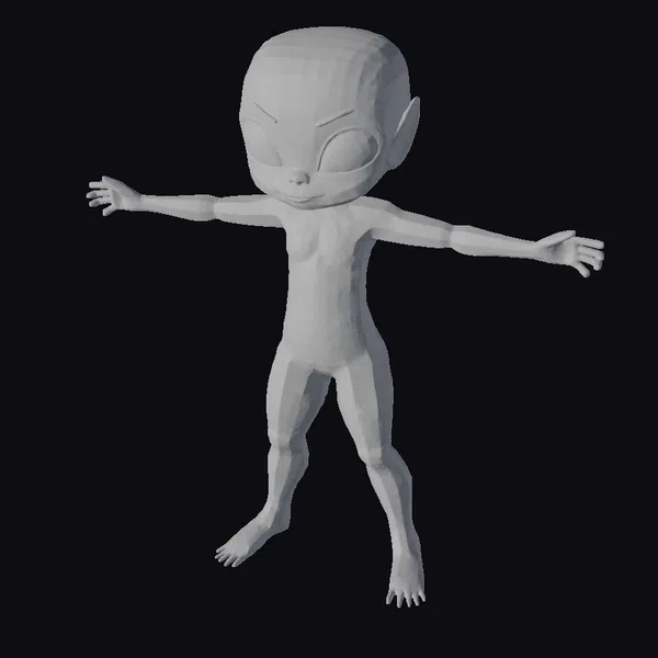 Standing tall with a rounded head, large almond-shaped eyes, and a small nose, this green alien character is meticulously detailed. Its smooth, glossy skin transitions from a bright green on the head and limbs to a slightly lighter shade on the torso, with creamy white patches adding a touch of warmth. The character’s pose, with arms outstretched and legs slightly apart, suggests a welcoming gesture. High-quality textures and lighting enhance the model’s visual appeal, making it perfect for various applications such as game development, animation projects, 3D printing, and virtual reality experiences.