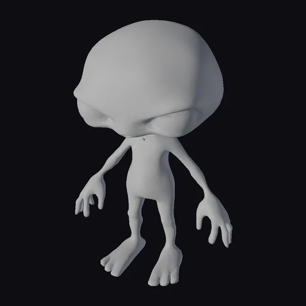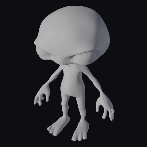 This Stylized Green Alien Creature model presents a detailed, cartoonish representation of an extraterrestrial being. The alien stands with its body slightly hunched forward, emphasizing its oversized, rounded head which is characterized by a smooth, vibrant green skin texture. The large, almond-shaped black eyes are striking, contributing to the creature’s enigmatic and somewhat eerie presence. The model’s body is lean and somewhat spindly, with long limbs that end in fingers and toes that are webbed to a degree, suggesting an adaptation to an environment very different from Earth’s. The overall pose of the alien, with its arms hanging loosely and fingers splayed, gives it a dynamic and lifelike appearance. The model is highly detailed, with subtle shading and texture that bring out the alien’s skin and muscular structure. Ideal for use in sci-fi projects, animations, games, or as a decorative piece, this model is versatile and ready to be integrated into various creative endeavors.