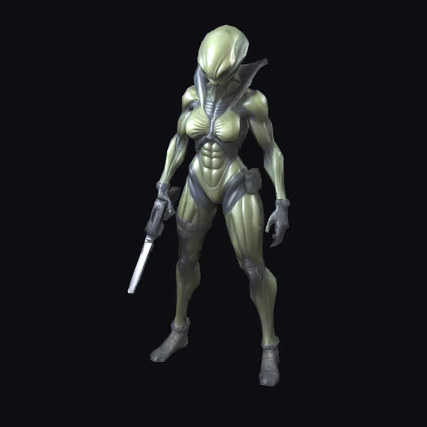 Rendered in exquisite detail, this green alien female warrior exudes an aura of strength and resilience. Her robust, muscular body is accentuated by the sleek military uniform she wears, complete with detailed textures and armor pieces. The character’s head is covered by an alien helmet, adding to her otherworldly appearance. She holds a weapon in her hand, suggesting readiness for battle. The model’s pose, with one weapon at her side, conveys a sense of alertness and power. This model is perfect for projects requiring a strong, sci-fi character, such as games, animations, or virtual reality experiences.