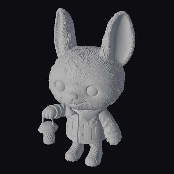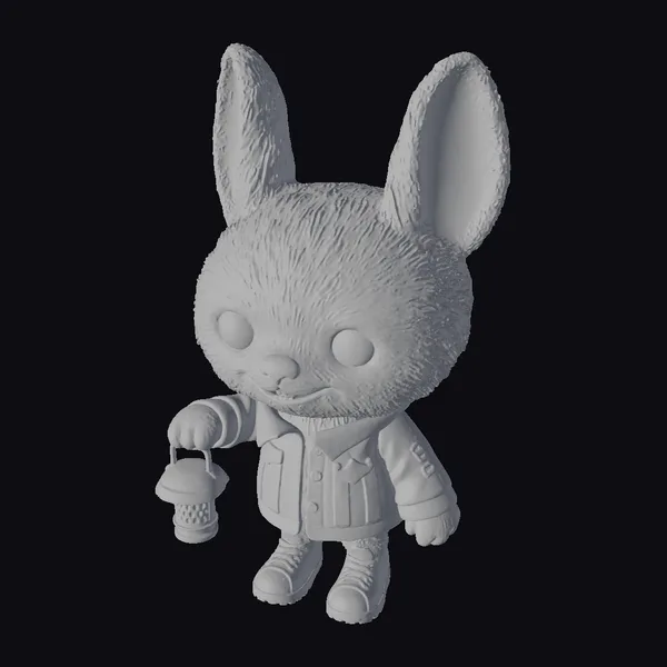 Standing tall with oversized ears and a fluffy green coat, this bunny character is meticulously detailed with a textured fur effect that invites the eye to linger. The character’s pose, with one hand holding a charming red mushroom-shaped lantern, suggests a readiness for exploration. The blue denim jacket with golden buttons and a yellow emblem adds a touch of personality, while the red sneakers with white laces offer a pop of color. This model is perfect for projects requiring a friendly, adventurous character, suitable for animation, game development, VR/AR experiences, and 3D printing. The stylized design ensures versatility across various creative applications.