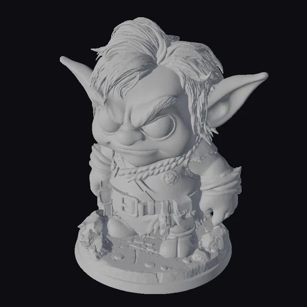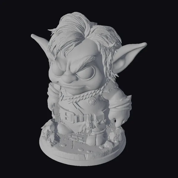 This chibi-style goblin figurine stands proudly on a detailed base that resembles a rocky, treasure-filled terrain. The goblin itself boasts bright green skin, accentuated by rosy cheeks and vibrant orange hair styled in a messy, tousled look. Its outfit consists of a tattered beige top, complemented by a brown belt and pouch, and a distinctive red rope necklace. The goblin’s left arm is wrapped in a brown bandage, adding to its rugged charm. The base is littered with gold coins and surrounded by stones, enhancing the adventurous atmosphere. Ideal for use in games, 3D printing projects, virtual reality experiences, animations, or as a decorative piece, this model is sure to capture attention with its unique blend of cuteness and menace.