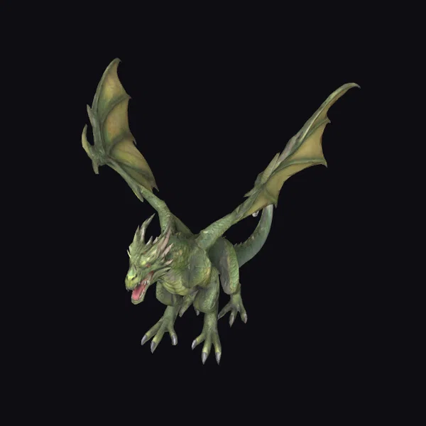 In a majestic pose, this green dragon model showcases intricate details, from the texture of its scaled skin to the sharpness of its claws. The wings, spread wide, display a beautiful gradient of green and yellow, suggesting movement and life. The dragon’s face, with its open mouth and fierce gaze, adds to the sense of dynamism. This model is perfect for projects requiring a mythical creature, such as animations, games, or architectural visualizations. Its high level of detail makes it suitable for close-up shots or as a central element in a fantasy scene.