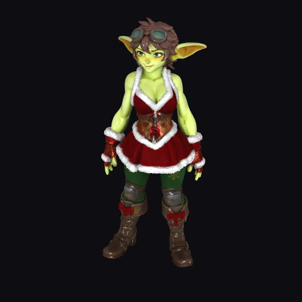 Standing tall with pointed ears and a playful demeanor, this stylized elf character is meticulously detailed with a green complexion, brown hair, and striking goggles. Her red dress with white fur trim, paired with green pants and brown boots adorned with red bows, captures a festive yet adventurous spirit. The model’s intricate design, from the texture of her skin to the accessories, makes it perfect for projects requiring a unique, fantastical character. Ideal for use in animations, games, VR/AR experiences, and designs that demand a touch of fantasy and playfulness.