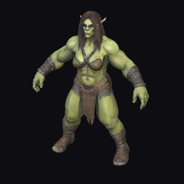 Detailed with precision, this 3D model of a green female orc warrior showcases intricate textures and a well-proportioned physique. Her green skin has a subtle gradient effect, enhancing the muscular definition. The studded leather bra and arm guards add a touch of ferocity, complemented by her long brown hair and sharp horns. The A-pose stance emphasizes her strength, with beefy thighs and boots that appear ready to take on any challenge. Ideal for game developers, animators, and designers looking for a high-quality fantasy creature model, this asset can be used in various projects, from video games to animations and virtual reality experiences.