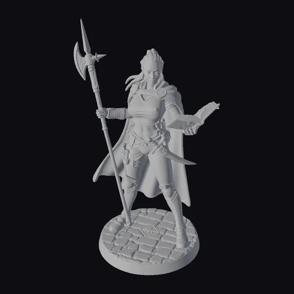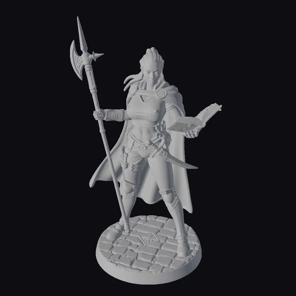 This meticulously crafted model showcases a female warrior with striking green skin, posed dynamically on a detailed stone base. Her dark hair is styled in a half-ponytail, framing her determined expression. She wears a white cropped top, dark pants, and armor, complemented by a flowing red cape with gold accents. In one hand, she holds a large, intricately designed axe, while the other grasps an open, ancient-looking book. The model’s textures and lighting accentuate her muscles and the intricate details of her attire and weapons. Ideal for use in games, 3D printing, VR/AR experiences, animation, and design projects, this model brings a unique blend of strength and intellect to any project.