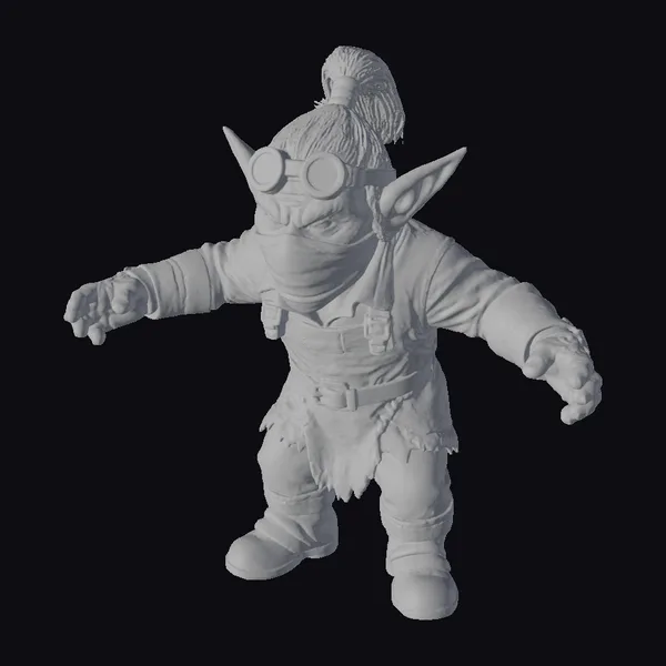 In a dynamic pose, this green goblin saboteur stands ready for action, its green skin and pointed ears a testament to its otherworldly origins. The character’s brown leather outfit, complete with a frayed vest and pants, is complemented by a pair of steampunk-inspired goggles perched atop a messy grey hairdo. A brown scarf covers the lower half of its face, adding an air of mystery to its already mischievous demeanor. The model’s intricate details, from the buckles on the belt to the texture of the skin, make it an ideal asset for games, animations, or 3D printing projects. The saboteur’s pose, with arms outstretched and eyes gleaming with mischief, invites the viewer to imagine the chaos it might unleash.