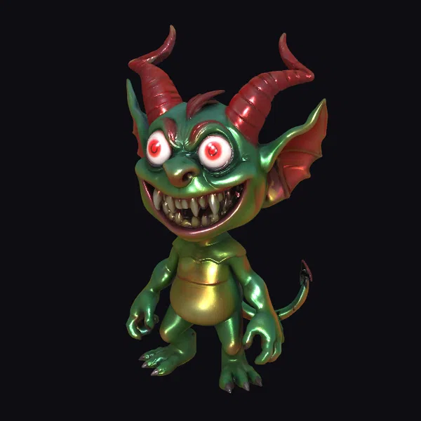 Step into a world of fantasy with this vibrant green goblin, boasting striking red horns and eyes that sparkle with mischief. Its shiny, metallic skin glistens in the light, inviting you to explore the intricate details of this whimsical creature.