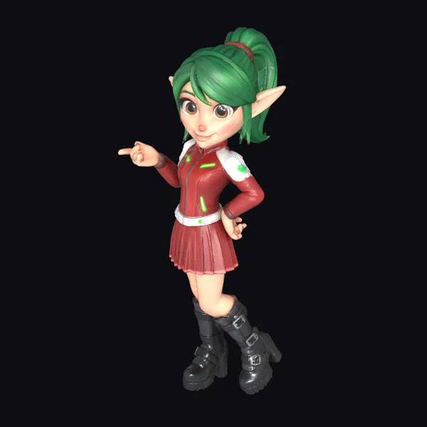 Detailed with a dynamic pose, the elf girl features a radiant green ponytail secured with a thin red band, complemented by her large, expressive brown eyes and pointed elf ears. Her outfit consists of a red jacket with white and green accents, a matching red pleated skirt, and black boots adorned with silver buckles. The model’s cartoonish style brings a lively and youthful vibe, making it perfect for projects requiring a whimsical character design. Suitable for animations, games, and virtual reality experiences, this model can bring a touch of fantasy and fun to various creative endeavors.