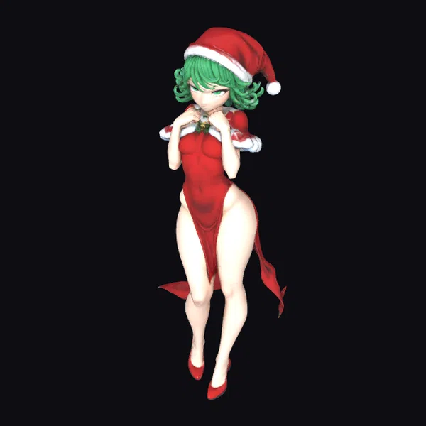 Detailed from head to toe, this stylized anime girl sports vibrant green hair and piercing green eyes, donning a tight-fitting red santa dress with a high slit and fur-trimmed sleeves. A matching santa hat tops her head, while red high heels accentuate her legs. A shiny green ornament hangs around her neck, adding to the festive vibe. Her hands are clasped to her chin, exuding a playful yet flirtatious mood. Ideal for games, animation projects, or as a decorative piece, this model captures the essence of a modern, cartoonish santa character.