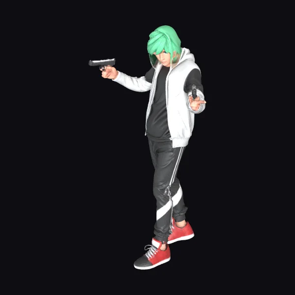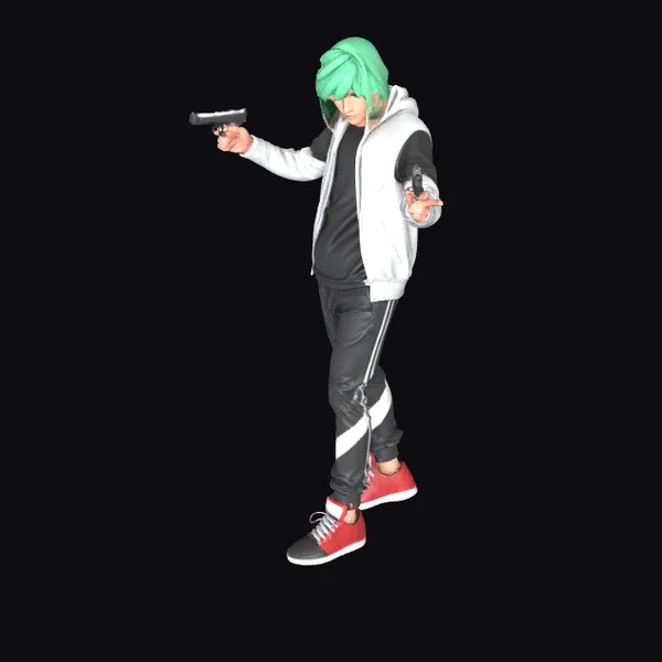 Detailed visual breakdown reveals a stylized character with striking green hair, wearing a white jacket over a black shirt, paired with black pants and distinctive red shoes. The character stands in a ready position, holding two pistols for a shooter game. Textures and lighting emphasize a modern, stylized look. Proportions are well-balanced for an anime-style character. This model excels in games, animation, and design projects requiring a unique character. Its stylized features make it perfect for projects needing a modern, edgy vibe.