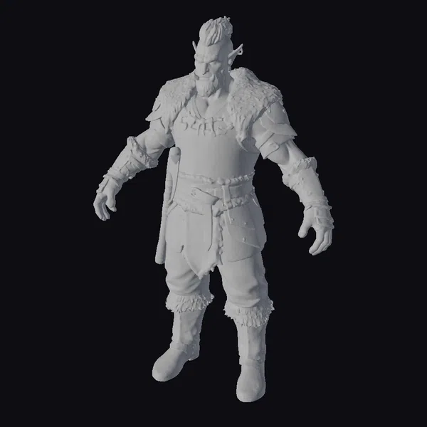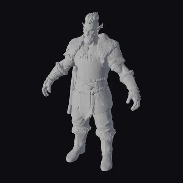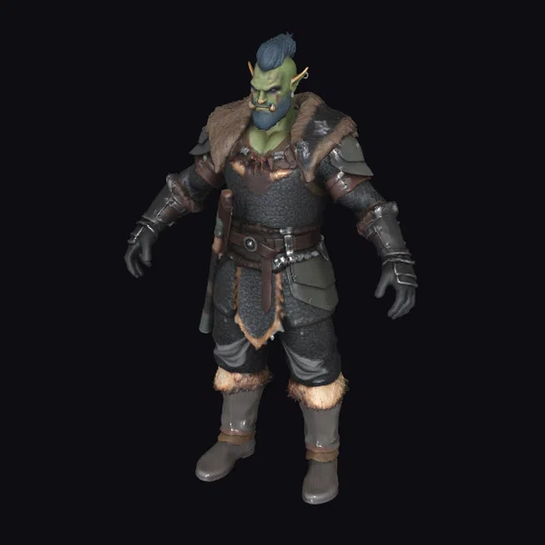 Standing tall with a muscular build, this half orc fighter boasts green skin, a distinctive blue mohawk, and a thick beard. His armor is a mix of dark leather and metal, adorned with fur trim, conveying a sense of ruggedness and battle-readiness. The detailed textures and realistic proportions make this model perfect for use in games, animation projects, or 3D printing. The character’s intense expression and dynamic pose capture the essence of a seasoned warrior, ready for battle.