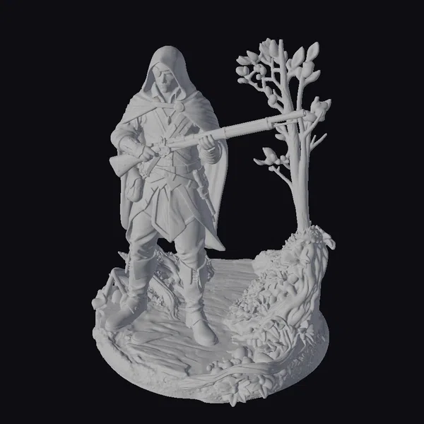 Positioned on a base of gnarled tree roots and moss, the green hooded ranger exudes an air of quiet confidence. The character’s attire, a mix of greens and browns, allows for perfect camouflage in a woodland setting. The rifle, held with a practiced ease, suggests a readiness for action. The figure’s serious expression and the detailed textures of the clothing and rifle create a compelling visual narrative. This model is ideal for use in games, animation, and print projects where a mysterious, skilled archer is needed. The detailed base and accessories add depth to any scene.