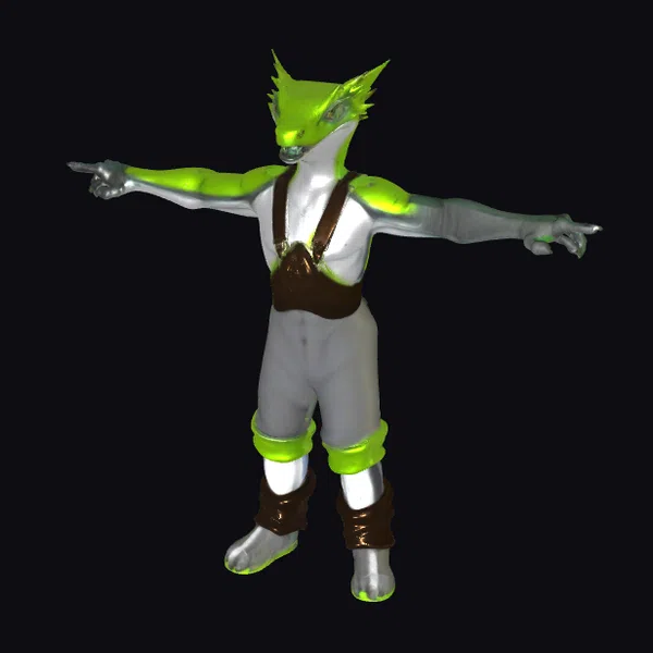 Standing tall with an air of mystique, this green humanoid creature is captured in a dynamic pose, arms extended and fingers splayed. The neon green hue of its skin is striking, particularly where it transitions to gray on the limbs, suggesting a blend of organic and synthetic elements. The character’s facial features are obscured, adding to its enigmatic presence. Its outfit consists of gray shorts and dark brown suspenders and leg wraps, which provide a practical yet stylish contrast to its vibrant skin tones. The model showcases intricate details such as texture variations and subtle shading, making it suitable for use in various applications including game development, animation projects, and virtual reality experiences.