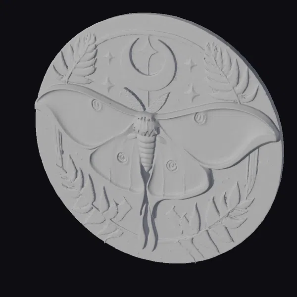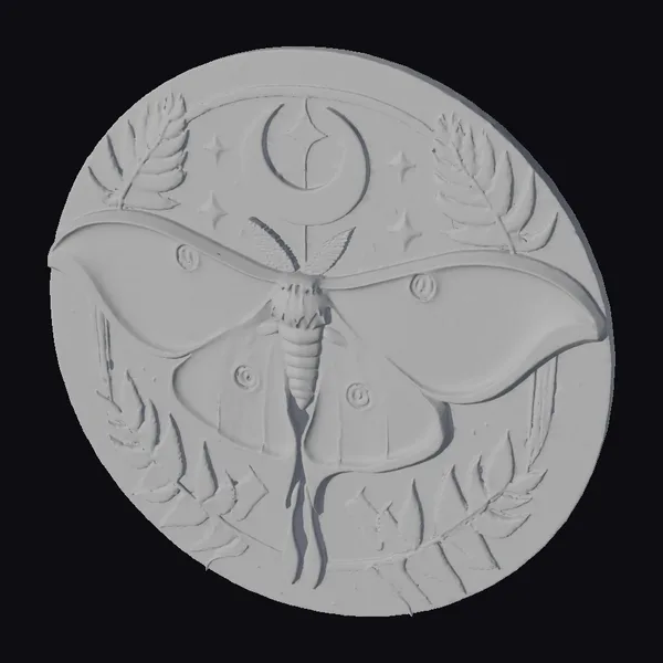 This intricately designed plaque features a stunning green luna moth with its wings spread wide, showcasing detailed textures and a mesmerizing color gradient. The moth is set against a celestial backdrop with a golden crescent moon and scattered stars, adding a touch of magic to the scene. Delicate leaves frame the moth, enhancing the natural and whimsical feel of the piece. The plaque’s detailed design and vibrant colors make it perfect for use in games, 3D printing, VR/AR experiences, animation projects, and design visualizations. The stylized yet realistic depiction of the moth and its surroundings invites viewers to step into a world of fantasy and wonder.