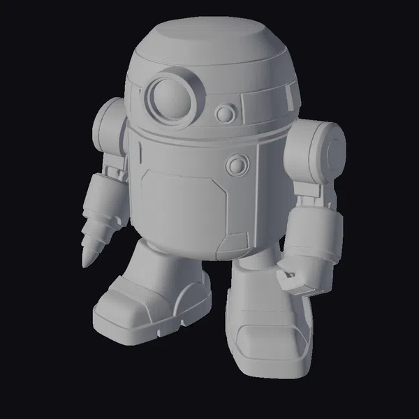 Standing with a slight forward lean, this robot’s rounded body is a mesmerizing blend of green and gold metallic surfaces. A large, glowing green eye on its front, accompanied by a smaller yellow one, gives it a curious appearance. The robot’s arms are equipped with what appears to be a drill on the right and a hollow cylindrical piece on the left. Its short legs are sturdy, ending in broad feet that add to its compact, endearing stature. The combination of colors and details suggests a design that’s both whimsical and advanced, making it a versatile asset for projects requiring a friendly robotic character. It can be used in animations, games, or as a design element in futuristic or sci-fi themed creations.