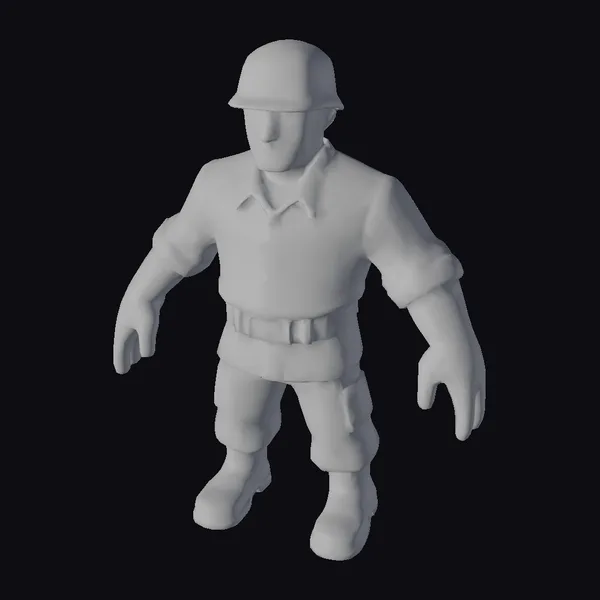 Detailed with a muted green helmet that covers the top of its head, this soldier model sports a classic military uniform with rolled-up sleeves, complete with two front pockets on its chest and a belt around its waist. The arms are slightly extended to the sides, suggesting a state of alertness. The model’s simplistic yet charming design makes it suitable for various applications, including games, animations, and graphic designs where a stylized military presence is needed. Its cartoonish style allows for easy customization to fit different narratives or branding needs.