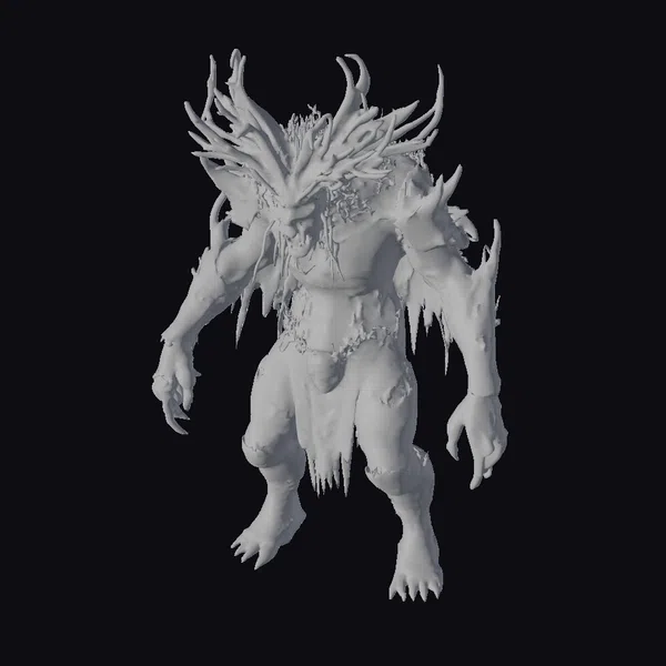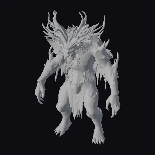 Standing tall with a muscular build, this green creature exudes an aura of intimidation. Its body is covered in a moss-like green texture, with sharp claws on its hands and feet, ready to pounce. The thorn-like protrusions on its head and back add to its fearsome appearance. The creature’s facial features are twisted in a snarl, revealing sharp teeth. This creature would be perfect for dark fantasy games, animations, or designs looking for a menacing character. Its detailed texture and lighting make it suitable for high-quality 3D models used in various applications such as print, VR/AR, and film.
