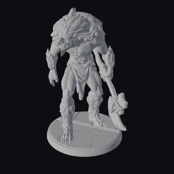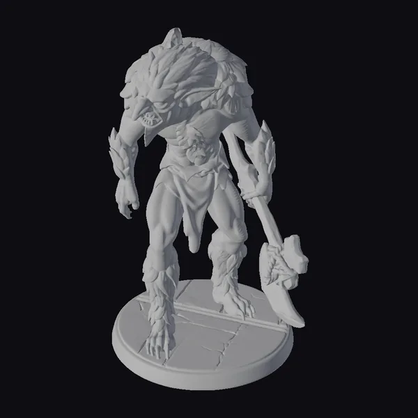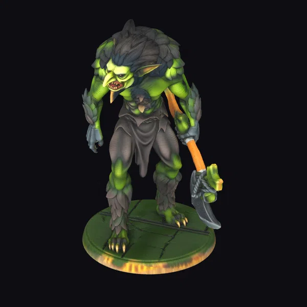 Standing on a cracked green base, this imposing creature boasts a vibrant green and dark furry texture, accentuated by sharp, glowing yellow eyes and razor-sharp teeth. Its muscular physique is clad in dark, tattered clothing, while its left hand grips a sturdy axe with an orange handle. The model’s intricate details, from the texture of its skin to the menacing snarl, make it an excellent choice for games, animations, or 3D printing. The creature’s dynamic pose and fierce expression evoke a sense of raw power and aggression, ideal for projects requiring a formidable, otherworldly character.