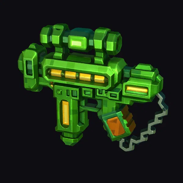 Detailed with precision, this vibrant green neon phaser blaster model showcases a bulky, futuristic design, complete with raised panels, chunky modules, and a distinctive zig-zag chain hanging from its grip. Glowing yellow accents add a pop of brightness, suggesting areas of high energy emission. Its asymmetrical design, with multiple protruding sections and a tubular magazine, gives it a menacing, otherworldly appearance. Ideal for game developers, 3D artists, and designers looking to add a touch of sci-fi flair to their projects, this model can be used in various applications such as game development, print, VR/AR experiences, animation, and design visualization.