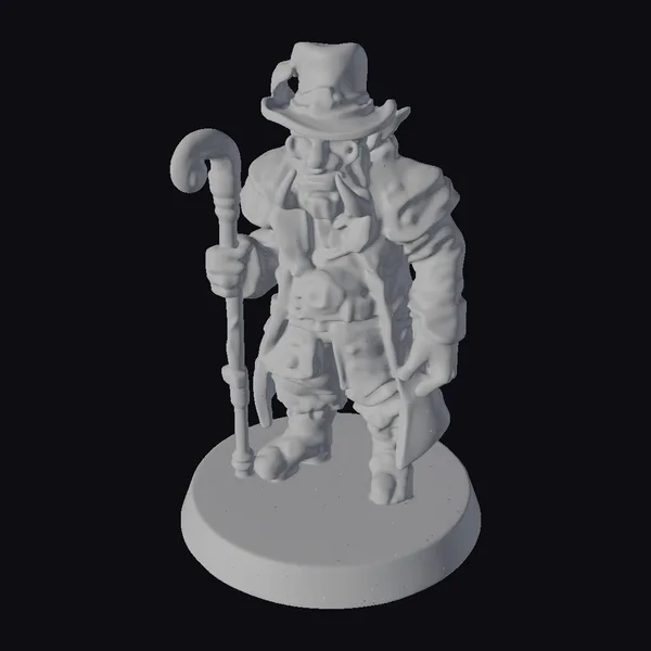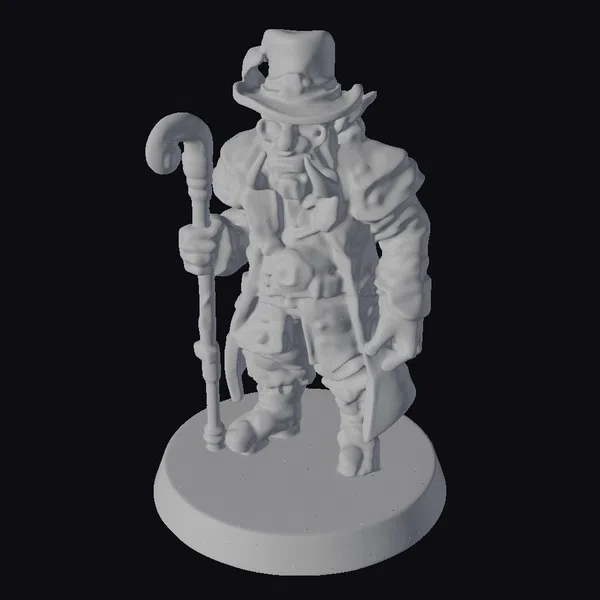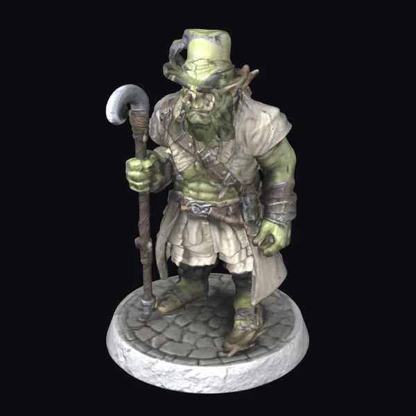 Standing proudly on a cobblestone base, the Green Orc Nobleman exudes an air of distinguished elegance. His green skin is meticulously textured, showcasing every detail from the subtle wrinkles on his face to the muscles beneath his semi-exposed torso. He wears a stylish hat atop his head, from which a feather dangles, adding to his noble demeanor. His outfit consists of a beautifully draped white shirt and shorts, complemented by leather straps and a metallic belt that cinches at his waist. A pair of glasses rests on the bridge of his nose, lending him an air of intellectual charm. In his right hand, he holds an intricately designed cane, its hook gleaming with a subtle sheen. This model is perfect for use in games, 3D printing, VR/AR experiences, animation projects, or as a detailed piece for design inspiration.