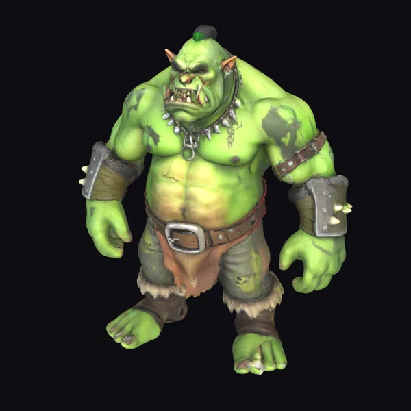 Standing imposingly with a muscular build and vibrant green skin, this orc warrior model boasts intricate details such as a spiked necklace, arm guards, and a fur-trimmed loincloth. The character’s sharp teeth and pointed ears add to its ferocious appearance, making it a compelling addition to any fantasy setting. Ideal for use in games, animations, or 3D print projects, this model brings a touch of mythical intensity to your creations.