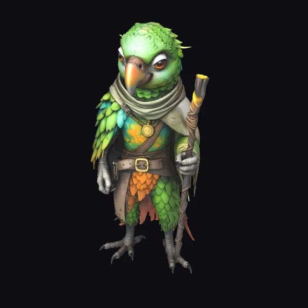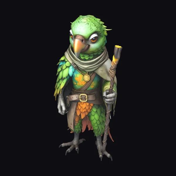 In a striking stance, the green parrot warlock showcases intricate details, from the texture of its fluffy head feathers to the scaly patterns on its chest and abdomen. The model boasts a dynamic pose, with the parrot’s gaze directed slightly to the side, as if sizing up its surroundings. The warlock’s accessories, including a leather belt, a pendant, and a staff wrapped in leather and adorned with a yellow tip, add to its mystical appearance. The cloak drapes elegantly around its body, with frayed edges suggesting a well-worn, magical artifact. This model is perfect for projects requiring a fantastical, whimsical touch, such as animations, games, or virtual reality experiences.