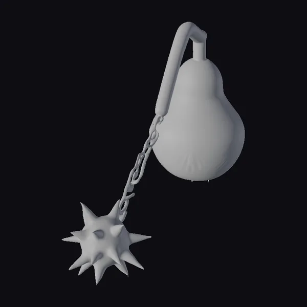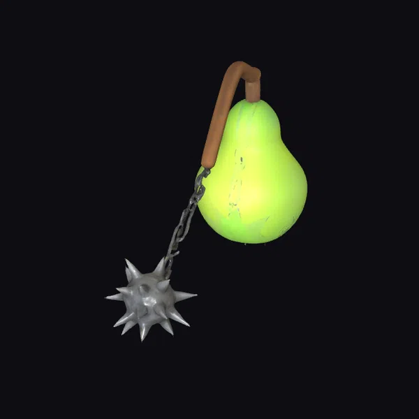 In a dynamic pose, the green pear flail showcases a pear with a slightly irregular shape, exhibiting a bright, lime-green hue that gradually lightens towards its center. The pear’s surface shows subtle scuffs and marks, adding to its rugged charm. A thick, brown leather handle is securely fastened to the pear’s stem, from which a sturdy metal chain extends, culminating in a menacing spiked ball. The flail exudes a whimsical yet formidable aura, making it a captivating addition to any fantasy or stylized setting. Ideal for use in games, animations, or designs requiring a touch of humor and fantasy.
