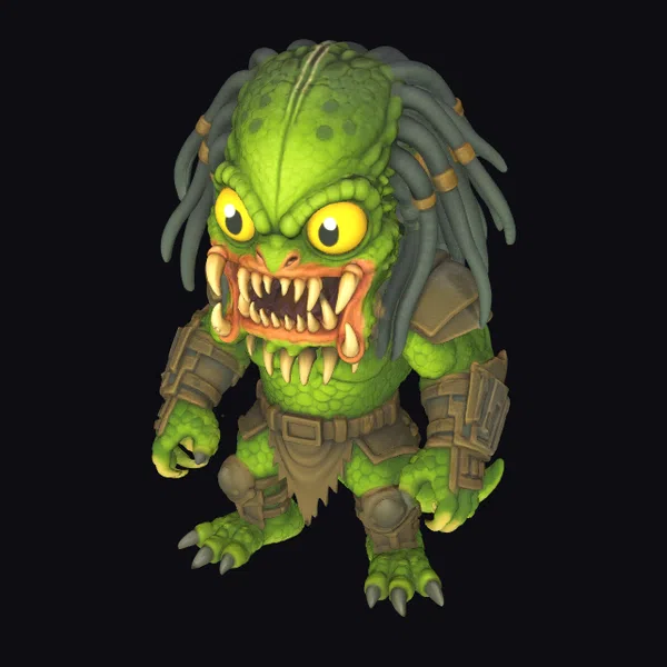 This stylized, green-scaled beast creature stands poised, its body angled forward in a dynamic stance. The creature’s head is dominated by long, green dreadlocks, which are secured with gold bands, adding to its exotic and fearsome appearance. Its eyes glow bright yellow, while its mouth is wide open, revealing rows of sharp, white teeth. The beast’s skin is a vibrant green, covered in darker green scales that add texture and depth to its appearance. It wears a set of brown metallic armor, complete with shoulder pads, a chest plate, and arm and leg guards, which contrast with its organic form. The armor is detailed with buckles and straps, suggesting a blend of organic ferocity and technological advancement. The creature’s sharp claws are another feature that highlights its predatory nature. This model would be perfect for use in games, animations, or virtual reality experiences where a fantastical, menacing character is needed.