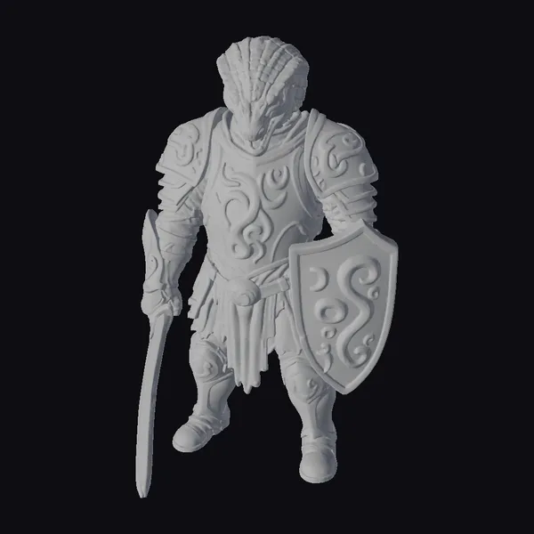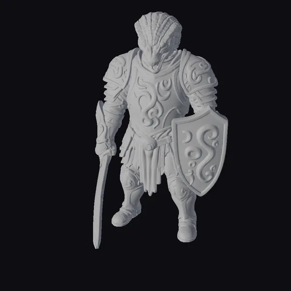Standing proudly with feet shoulder-width apart, the green scaly knight’s armor is a marvel of detailed craftsmanship. The emerald green base is adorned with gold accents that catch the light, suggesting a rich history of battles and conquests. Its sword, held firmly in one hand, and shield, emblazoned with a serpent motif in the other, are poised for action. The reptilian head, complete with textured scales, adds a layer of ferocity and otherworldliness. This model is perfect for game developers, animators, and designers looking to add a touch of fantasy and heroism to their projects. Its high level of detail makes it suitable for close-up shots in animations, virtual reality experiences, or as a centerpiece in a 3D printed diorama.