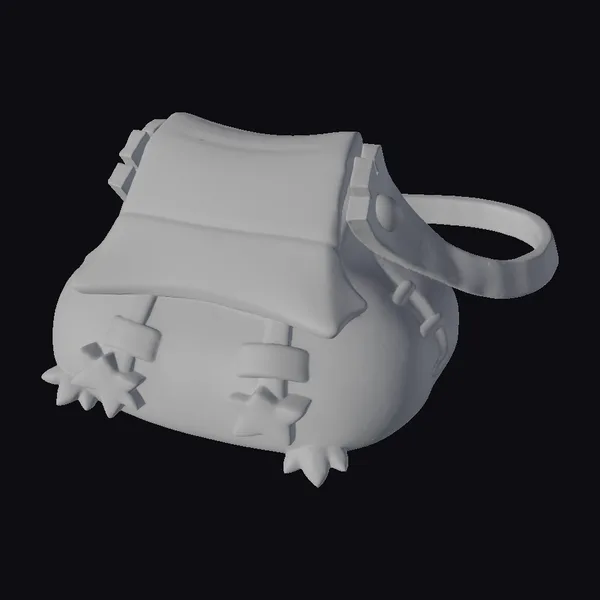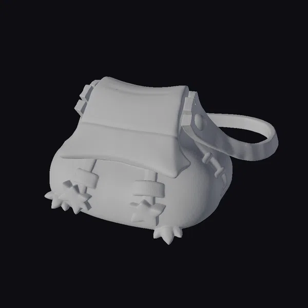 Positioned at a slight angle, the satchel’s olive-green body is accentuated by a white flap with a vibrant orange stripe, while star-shaped buckles on the front add a playful touch. The soft, glowing light emanating from within highlights the satchel’s intricate details, including the textured, star-tipped feet. The strap, secured with a shiny gold button, flows smoothly into a looped handle, perfect for slinging over the shoulder. This stylized satchel model is ideal for adding a dash of fantasy to games, animations, or 3D scenes. Its unique design and vibrant colors make it a standout accessory for any project.