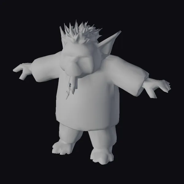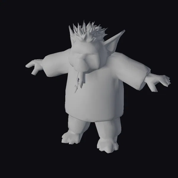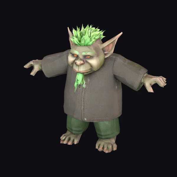 This fantastical troll character stands ready with arms outstretched, showcasing its detailed green spiky hair and vibrant orange eyes. The troll’s complexion is a mix of green and gray, with visible texture on its skin. It wears a brown jacket with a zipper and green pants, giving it a quirky look. The bare feet and sharp ears emphasize its creature nature. A unique green beard-like feature dangles from its chin, adding to its playful demeanor. This model excels in games, animation, and design projects where a whimsical character is needed. Its detailed features and vivid colors make it perfect for bringing fantasy worlds to life.