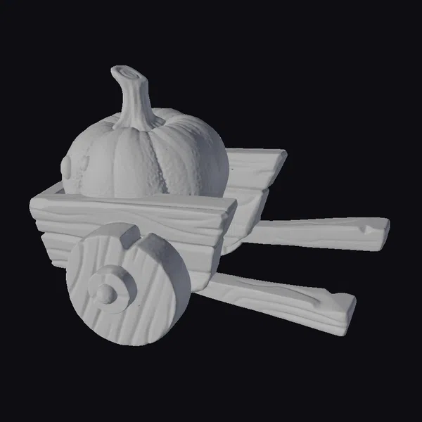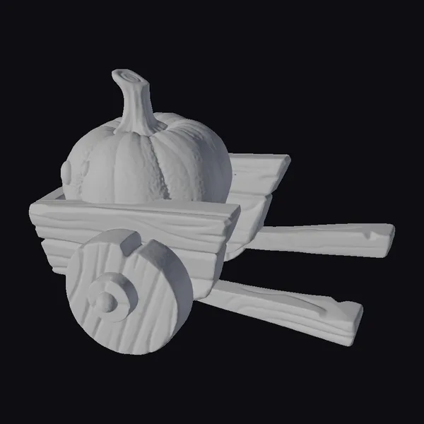 Positioned at a charming angle, the wheelbarrow’s wooden slats boast a warm, light brown hue, while its green frame and wheel gleam with a subtle sheen. The wheelbarrow’s contents, a robust pumpkin with deep orange skin and a bright green stem, seem to radiate a cozy autumnal glow. As the wheelbarrow’s handles stretch out to either side, its blue bolts catch the light, infusing the entire scene with a sense of rustic whimsy. Ideal for adding a touch of seasonal charm to games, animations, or 3D designs, this delightful model is sure to captivate audiences of all ages.