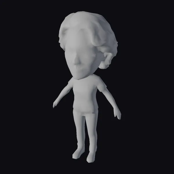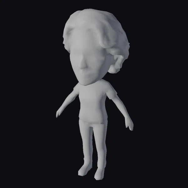 Detailed with a large head and stylized features, this avatar stands out with its grey hair styled in a wavy manner, paired with a vibrant coral shirt, blue jeans, and white sneakers. The model’s pose, with arms slightly extended to the sides, suggests a dynamic yet approachable demeanor. Its cartoonish style makes it suitable for various applications, including games, animations, and virtual reality experiences, where a relatable and engaging character is needed.