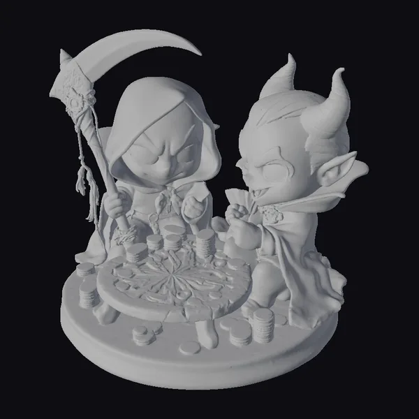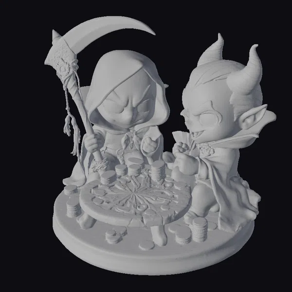 Delve into a macabre world of playful darkness with this detailed 3D model of a grim reaper and a vampire caught in a moment of tense amusement, playing poker on a round table adorned with a crimson and silver design. The grim reaper, clad in a black hooded cloak, holds a scythe in one hand and a card in the other, while the vampire, sporting a stylish black and red outfit, examines his hand with a mixture of curiosity and cunning. The base is littered with stacks of poker chips, adding to the scene’s immersive depth. Crafted in a chibi style, this model brings a touch of whimsy to any project, whether it’s for game development, animation, or design. The bold, vibrant colors and dynamic pose ensure it stands out, capturing the essence of a fantastical, gothic humor.