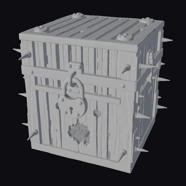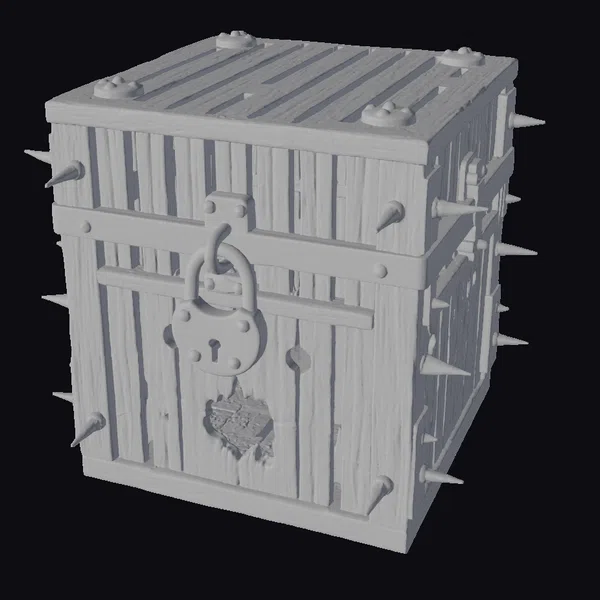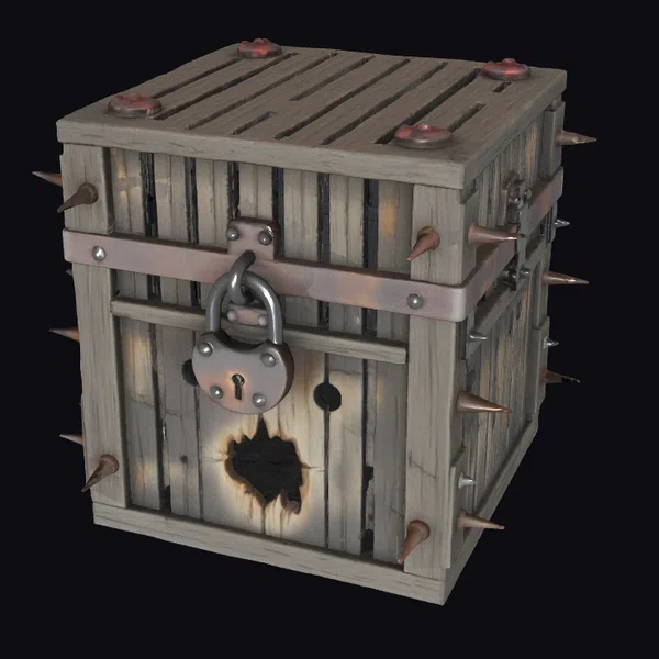 Perched on a slight angle, the crate’s wooden slats display a range of grayish-brown hues, with darker stripes indicating wear and tear. The metal padlock, adorned with a keyhole, hangs from a sturdy metal band that wraps around the crate’s body. Copper-colored spikes protrude from the crate’s edges, adding to its intimidating appearance. A large burn mark on one side of the crate seems to glow with an inner light. The crate’s rugged texture and battered appearance make it perfect for adding a touch of grit and realism to games, animations, or 3D designs.