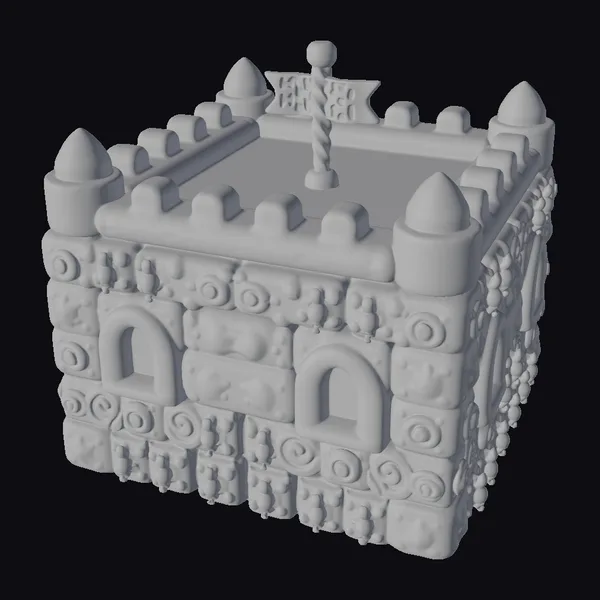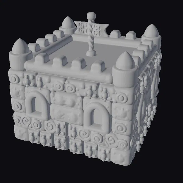 Perched on a base of gummy bears, this charming castle boasts a sturdy structure composed of pink and purple blocks, adorned with swirls, spirals, and cute gummy bear details. The square-shaped fortress features towers at each corner, complete with glittering purple turrets. A red and white striped candy cane stands tall on the flat top, adding a pop of color. The intricate design and vibrant colors bring this sugary fortress to life. Perfect for kids’ rooms, games, animations, or 3D printing, this gummy bear castle model is sure to delight. Its playful design and bright colors make it an ideal addition to any creative project.