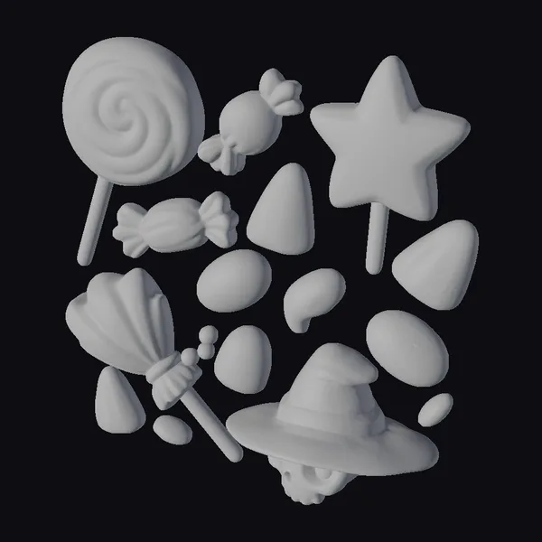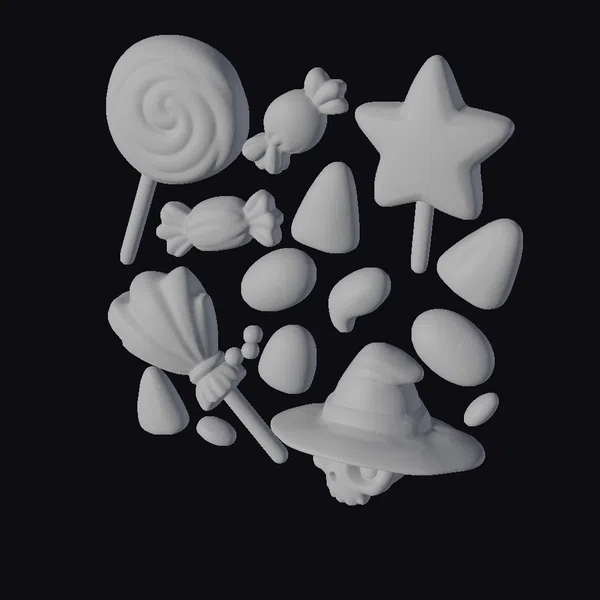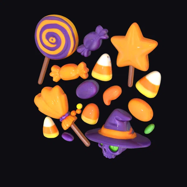 Deep in a cauldron of creativity, a medley of Halloween treats bubbles up, each one meticulously crafted to capture the essence of the spooky season. The assortment includes a giant lollipop with swirling purple and orange patterns, a star-shaped candy that shines bright, and a witch’s hat tipped with a skull that sports glowing green eyes. Surrounding these are pieces of candy corn, some wrapped in colorful papers, and an array of other sweets that appear as if they’ve been freshly poured out of a trick-or-treat bag. The 3D models boast high-quality textures and details, from the glossy finish of the candies to the intricate design on the witch’s hat. These models are perfect for use in games, 3D printing, virtual reality experiences, animations, or as design elements for websites and applications looking to capture a festive and whimsical vibe.