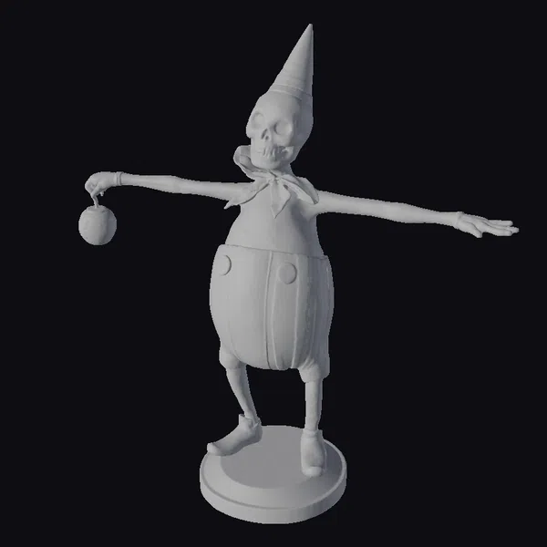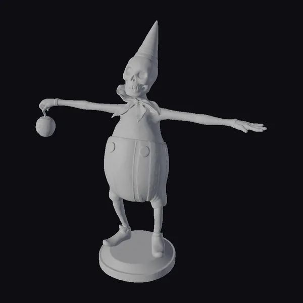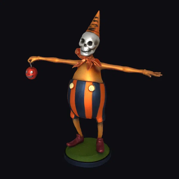 Detailed with precision, this stylized 3D model showcases a skeleton character dressed in a classic jester’s attire, complete with a pointed hat adorned with black stripes, a playful orange and black striped pant, and a bright orange shirt. The skeletal head, devoid of skin, adds a touch of macabre to the otherwise cheerful appearance. The figure stands on a small green base, adding a pop of color to the overall design. The model’s pose, with arms outstretched and a red ornament held in one hand, exudes a sense of invitation or jest. This model is perfect for use in games, 3D printing, VR/AR experiences, animations, or designs that require a unique, eye-catching character.