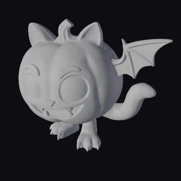 Detailed with precision, this 3D model showcases a fantastical creature with a pumpkin head, complete with a green stem and vibrant orange, purple, and green stripes. Its large, glowing eyes sparkle with mischief, while its sharp teeth and claws hint at a playful yet spooky nature. The creature’s body is a delightful mix of a cat’s form with a bat’s wings, adding to its fantastical appeal. The model is posed in a dynamic, slightly crouched position, as if ready to pounce or take flight. Textures are smooth and glossy, with subtle shading that enhances the model’s cartoonish charm. Ideal for use in animations, games, or as a decorative element for Halloween-themed projects, this model is sure to captivate audiences with its unique blend of cuteness and spookiness.