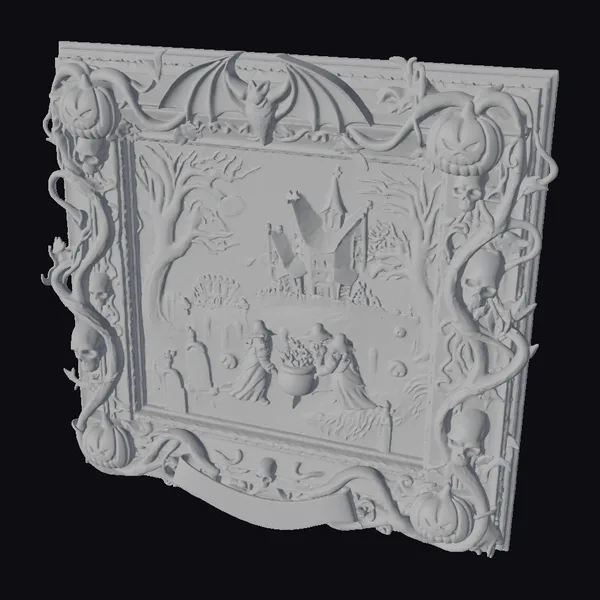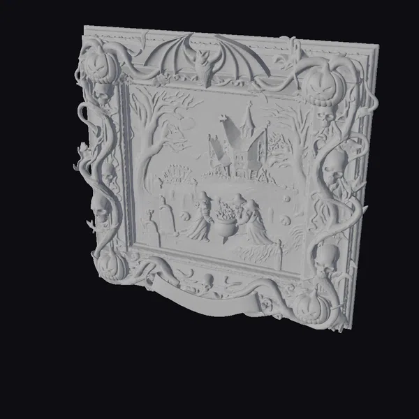 Detailed with precision, this ornate picture frame features a haunting scene of witches gathered around a bubbling cauldron, surrounded by jack-o’-lanterns, tombstones, and a sprawling haunted mansion in the background. The frame itself is adorned with twisted vines, skulls, bats, and pumpkins, adding to the eerie ambiance. Crafted with meticulous attention to detail, this model is perfect for those looking to add a touch of Halloween spirit to their projects, whether it’s for game development, animation, or 3D printing. The frame’s golden hue and the scene’s vibrant colors against a misty blue sky make for a compelling visual. Ideal for enhancing scenes in games, animations, or virtual reality experiences.
