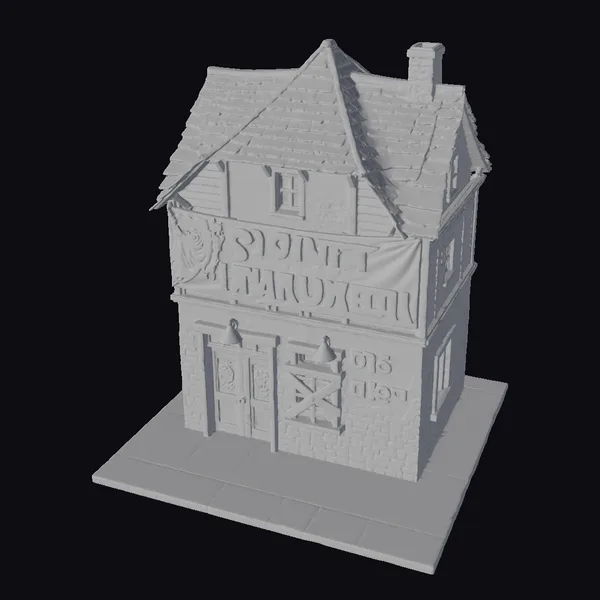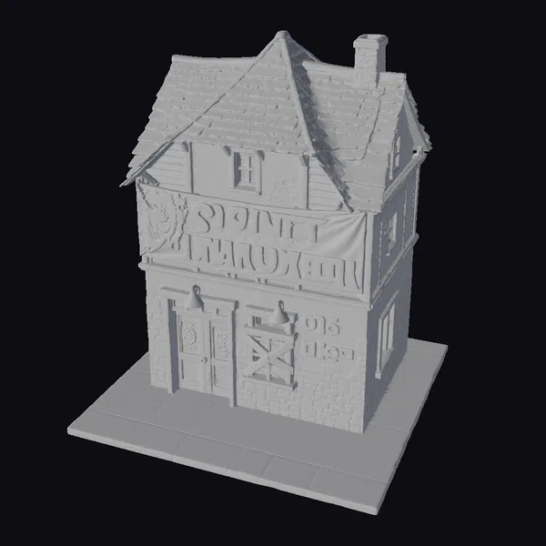 Perched on a tiled platform, this charming two-story wooden store boasts a rustic charm with its brown shingled roof, chimney, and wooden sign creaking in the wind. The ground floor features a wooden door adorned with glowing jack-o-lanterns and a crossboarded window, while the upper floor showcases a vibrant orange banner proclaiming ‘Spirit of Halloween’, accompanied by ghostly figures. The store’s texture and lighting evoke a sense of nostalgia and eeriness, perfect for adding a touch of Halloween magic to any scene. Ideal for use in games, 3D printing, VR/AR experiences, animation, and design projects.