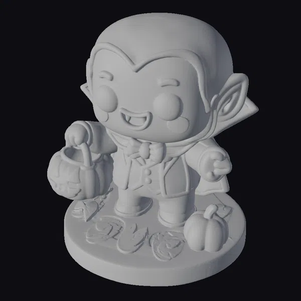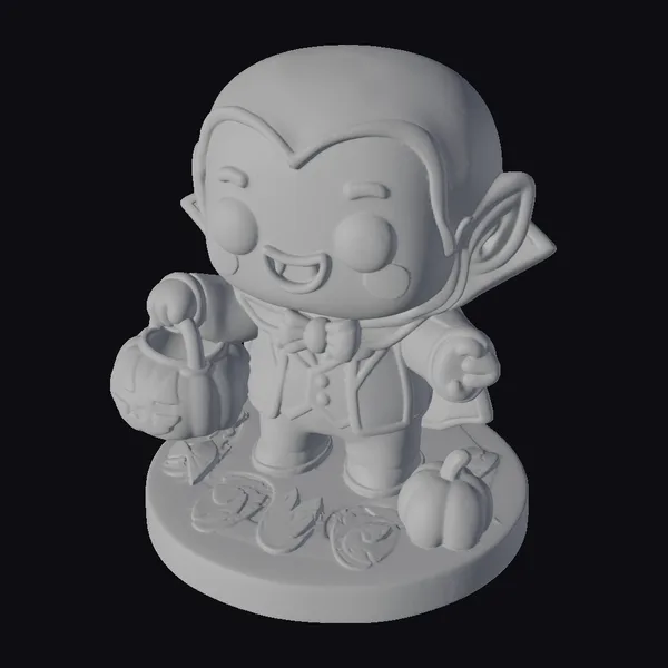 Standing on a base adorned with fallen leaves and a small pumpkin, this vampire kid exudes a friendly aura with his wide-eyed stare and rosy cheeks. His black hair is styled in a modern, edgy cut, complementing his sharp vampire ears. The character’s outfit consists of a sleek black suit with a bold red vest and matching bow tie, complete with a cape flowing behind him. The carved pumpkin he holds adds to the festive atmosphere, suggesting use in Halloween-themed games, animations, or 3D printed decorations. The model’s cartoonish style ensures it will appeal to a wide range of audiences, from children to adults looking for a non-threatening vampire character.