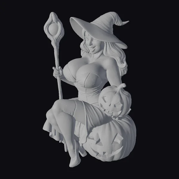 Intricately detailed, this stylized witch figurine sits confidently on a large, carved pumpkin, her black dress and hat a stark contrast to the vibrant orange of her throne. Her blonde hair cascades down her back as she grasps a staff with a glowing orb at its tip. The witch’s attire is complemented by black stockings and heels, adding to her mystique. The pumpkin beneath her has a classic, eerie face carved into it, while she holds a smaller, similarly carved pumpkin in her lap. This model is perfect for use in games, 3D printing, VR/AR experiences, animation, and design projects, offering a rich, high-quality visual element to enhance any Halloween-themed creation.