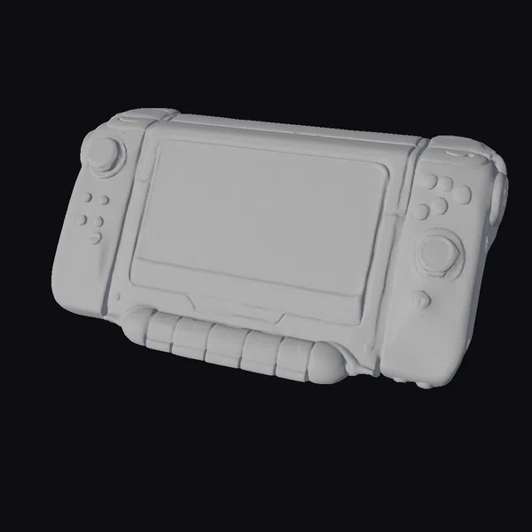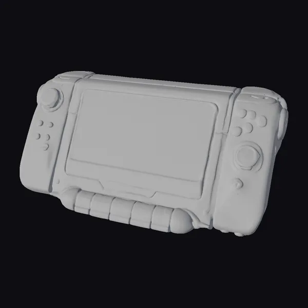 Positioned at a dynamic angle, the console’s detailed design showcases a large screen flanked by dual control sets, each complete with joysticks and button clusters. The rugged texture and red accents inject a sense of energy and resilience. The device’s modern aesthetic makes it a standout in the world of portable gaming. Ideal for use in games, animations, and design projects, this model brings a touch of contemporary tech to any creative endeavor.