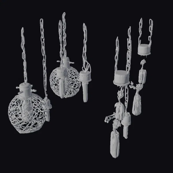Detailed to perfection, these pendant lights feature intricate metalwork with gold and industrial-style finishes. The shades are adorned with perforations that allow light to filter through, creating a warm ambiance. Chains suspend the fixtures, adding an industrial touch. The bulbs are visible, with clear glass and a slight texture to suggest realism. These models are perfect for interior design projects, architectural visualizations, or product showcases in 3D environments. They can be used in games, print materials, VR/AR experiences, animations, and design presentations.