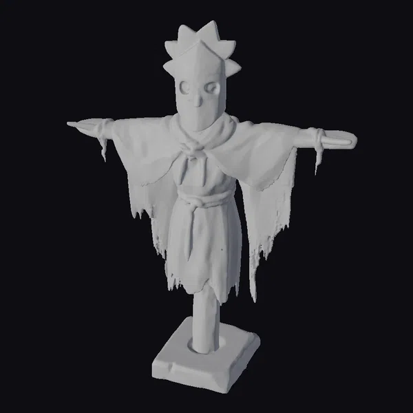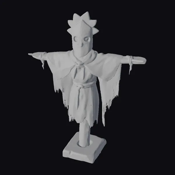 Detailed with precision, this scarecrow figure stands proudly on a wooden base, its tattered cloak and hat suggesting a life of rustic service. The mask, with its ornate design and wide-eyed stare, adds a layer of mystique, inviting onlookers to ponder the stories it might tell. As the seasons change, this piece remains a versatile centerpiece for autumnal decor, equally at home in a cozy indoor setting or as part of a larger outdoor display. Its stylized features make it a standout in any collection, whether for personal enjoyment or as a unique addition to a creative project. From games and animations to print and VR/AR experiences, this scarecrow model brings a touch of seasonal charm to any medium.