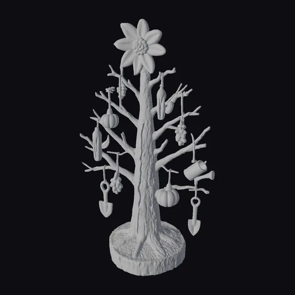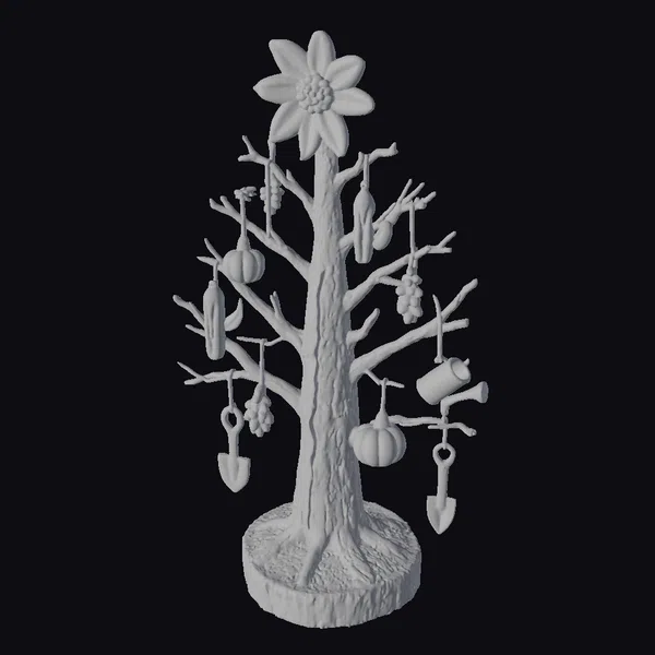 Perched on a wooden base, this intricately designed tree features a sturdy brown trunk with sprawling branches, each adorned with an assortment of items. Vibrant orange pumpkins and green cacti hang alongside gardening tools like shovels and watering cans. The tree is crowned with a large, delicate white flower. The combination of textures, from the rough tree bark to the smooth pumpkins and tools, adds depth to this decorative piece. The stylized approach gives the tree a fantastical feel, making it perfect for use in games, animations, or as a unique design element in virtual reality environments.
