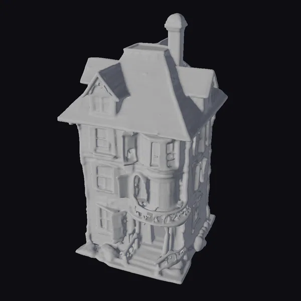 Perched precariously, this three-story haunted mansion appears to lean into the wind, its gray stone walls bearing the scars of time and neglect. The steeply pitched roof, adorned with multiple gables and a central chimney, seems to be on the verge of collapse. Warm light emanates from the numerous windows, casting a golden glow on the dark surroundings. A wraparound porch, complete with a balcony on the second floor, adds to the mansion’s eerie charm. Ideal for use in games, 3D printing, VR/AR experiences, animation, and architectural design projects.