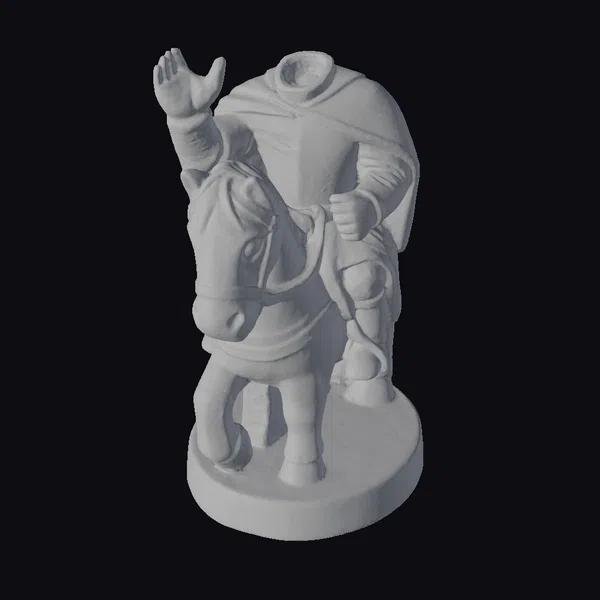 Positioned dynamically on a circular wooden base, the headless knight is captured in mid-gesture, his right hand raised in a beckoning motion. The wooden texture of the statue showcases a rich, warm grain that adds depth and authenticity to the piece. The knight’s armor and cloak are intricately detailed, with folds and creases that suggest movement and life. The horse, too, is finely rendered, its muscles tensed as if ready to gallop. This statue would be a compelling addition to any collection or display, suitable for use in games, 3D printing, VR/AR experiences, animation, and design projects. Its unique blend of fantasy and realism sparks imagination and invites storytelling.
