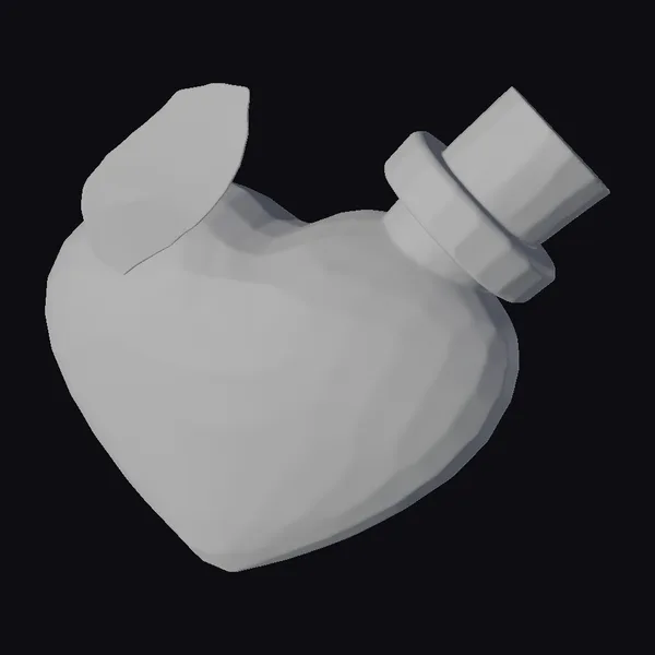 Positioned at a charming angle, the heart-shaped bottle takes center stage, its dark brown liquid shimmering with an irresistible glow. The cork, crafted from a warm brown material, sits atop the bottle’s silver screw cap, exuding a sense of vintage elegance. A slice of peach, its pit carved into a heart, rests on the bottle’s left side, adding a touch of playfulness. The bottle’s surface gradates from deep red at the bottom to dark brown at the top, with subtle light reflections that enhance its glossy appearance. This stylized model is perfect for projects requiring a romantic or whimsical touch, such as game development, animation, or design. Its detailed textures and vibrant colors ensure it stands out in any 3D environment.